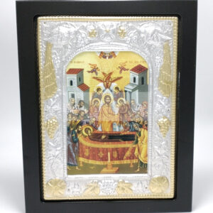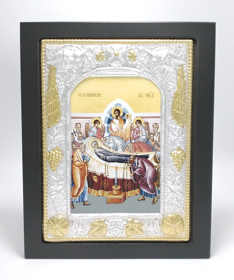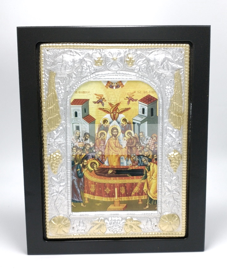 Icoana metalica pe lemn Adormirea Maicii Domnului – un simbol al credinței, potrivit pentru binecuvântarea locuinței.
