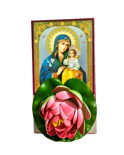 Maica Domnului cu floarea Crinul, realizată cu atenție la detalii, potrivită pentru casă sau pentru a fi oferită celor dragi.